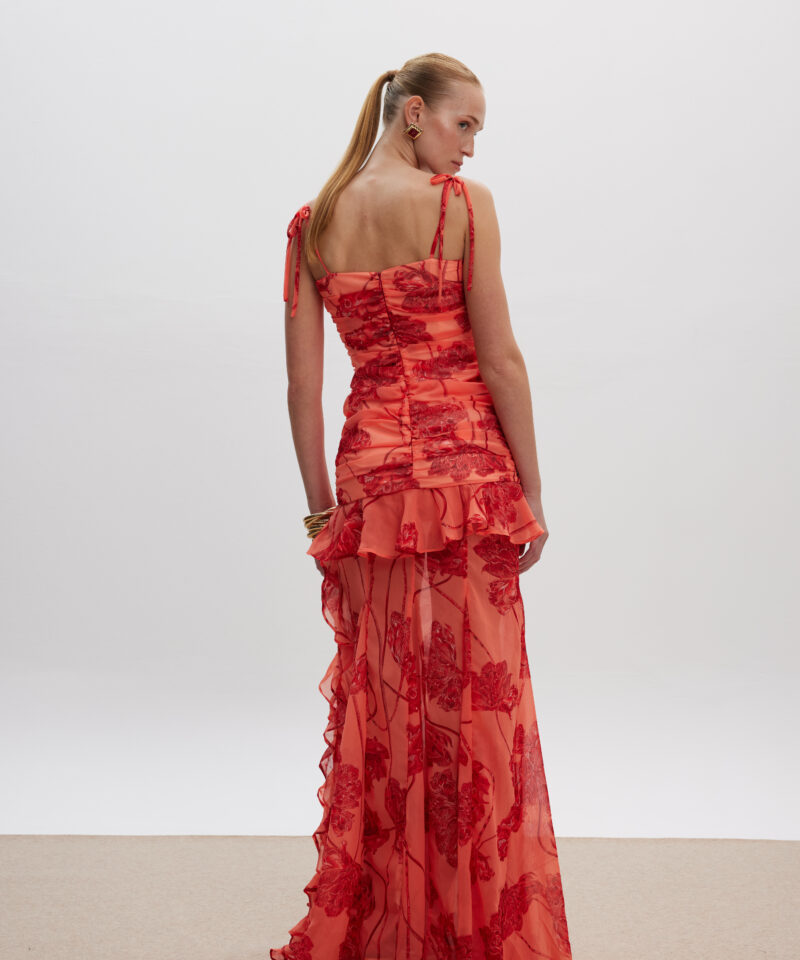 Μάξι φόρεμα με λεπτομέρεια βολάν, τιράντες που δένουν, φόδρα και κλείσιμο με φερμουάρ στην πλάτη