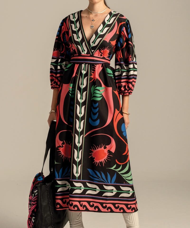 Στοιχεία αυτοπεποίθησης χαρακτηρίζουν το εξαιρετικά θηλυκό μας φόρεμα Narcissus. Τα φουσκωτά μανίκια 3/4 που τελειώνουν σε ελαστικές μανσέτες και η πλήρης φούστα αντισταθμίζονται από ένα γοητευτικό ντεκολτέ με εφέ περιτύλιξης και μια ασορτί ζώνη που δένεται στο πίσω μέρος που τονίζει τη μέση. Ένα σχέδιο τοποθέτησης πολύχρωμης χλωρίδας και πανίδας σε μαύρο χρώμα με ένα έντονο βοτανικό περίγραμμα αιωρείται σε αυτό το βαμβακερό μίντι φόρεμα από ποπλίνα με ελαστάνη, για άνεση. Ανακαλύψτε το εξαιρετικό σχέδιο αυτού του ενδύματος, κατασκευασμένο με την τεχνική τοποθέτησης. Κάθε μέρος του ενδύματος διαθέτει ένα μοναδικό σχέδιο και όταν συνδυάζονται, δημιουργούν ένα πραγματικό αριστούργημα.