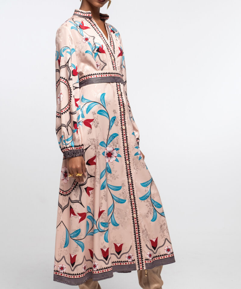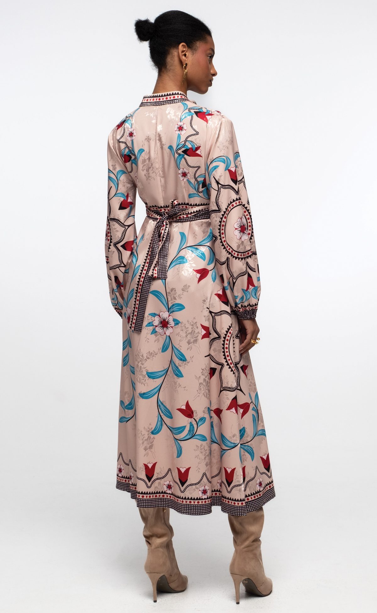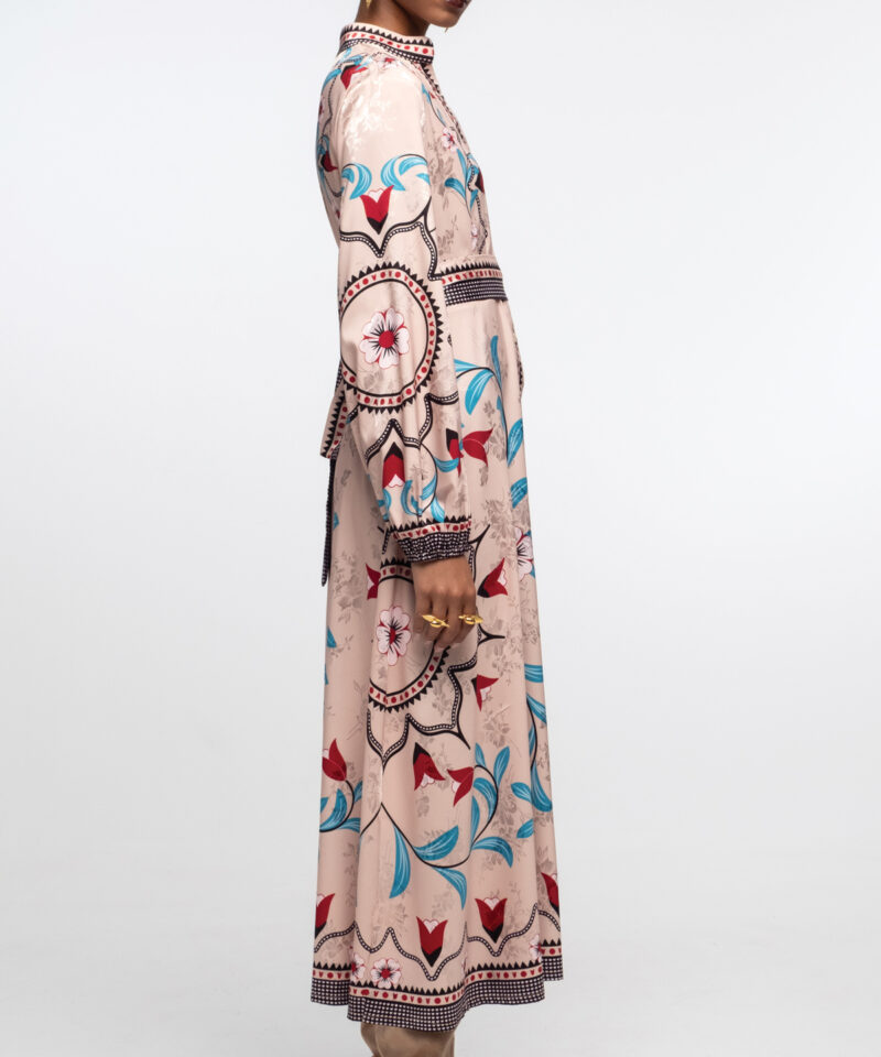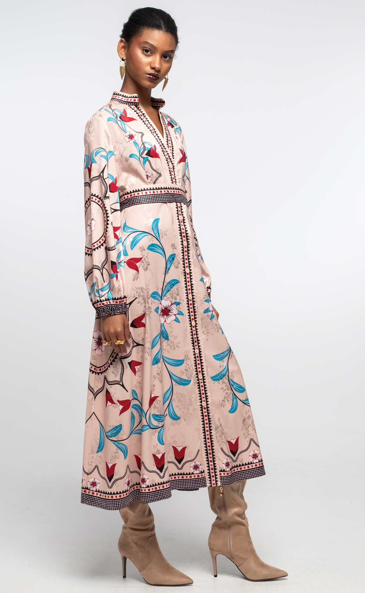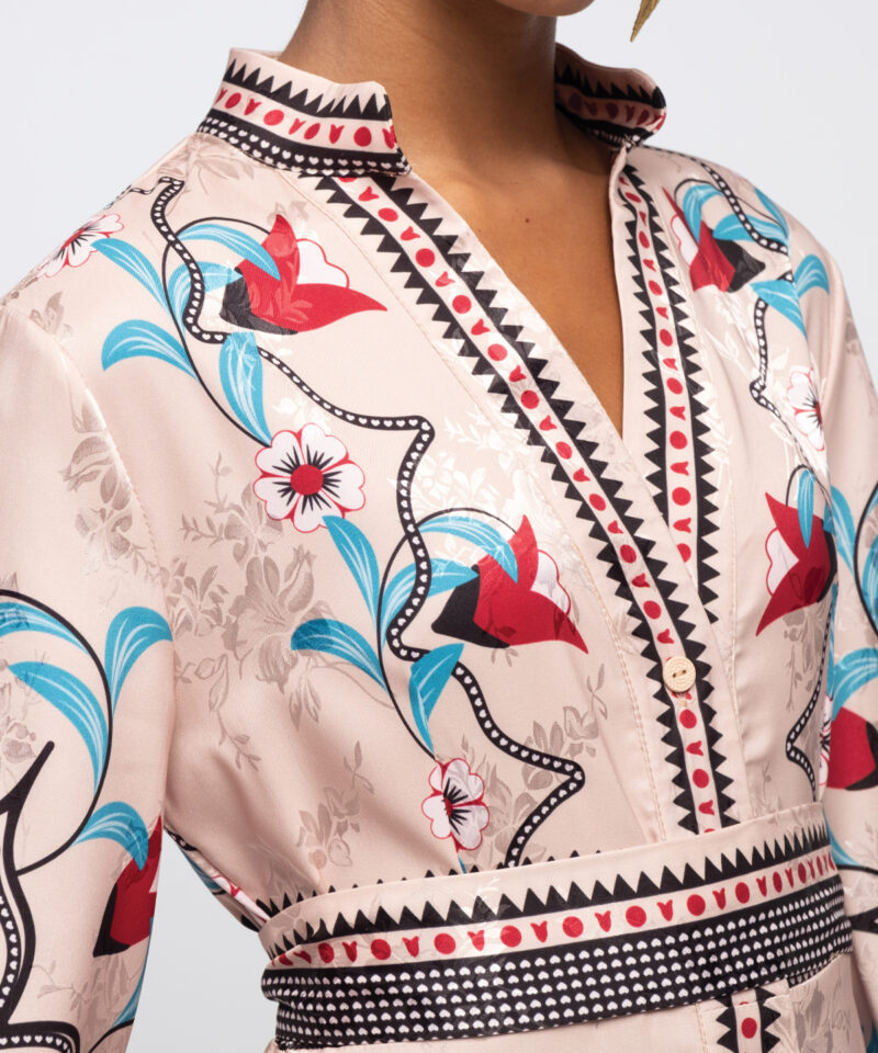 Το Tulip Shirt Dress είναι ένα κομψό φόρεμα, ιδανικό για τη μετάβαση από το καλοκαίρι στο φθινόπωρο. Φτιαγμένο από γυαλιστερό σατέν jacquard ύφασμα με floral print σε κόκκινες και μπλε αποχρώσεις πάνω σε cream φόντο.